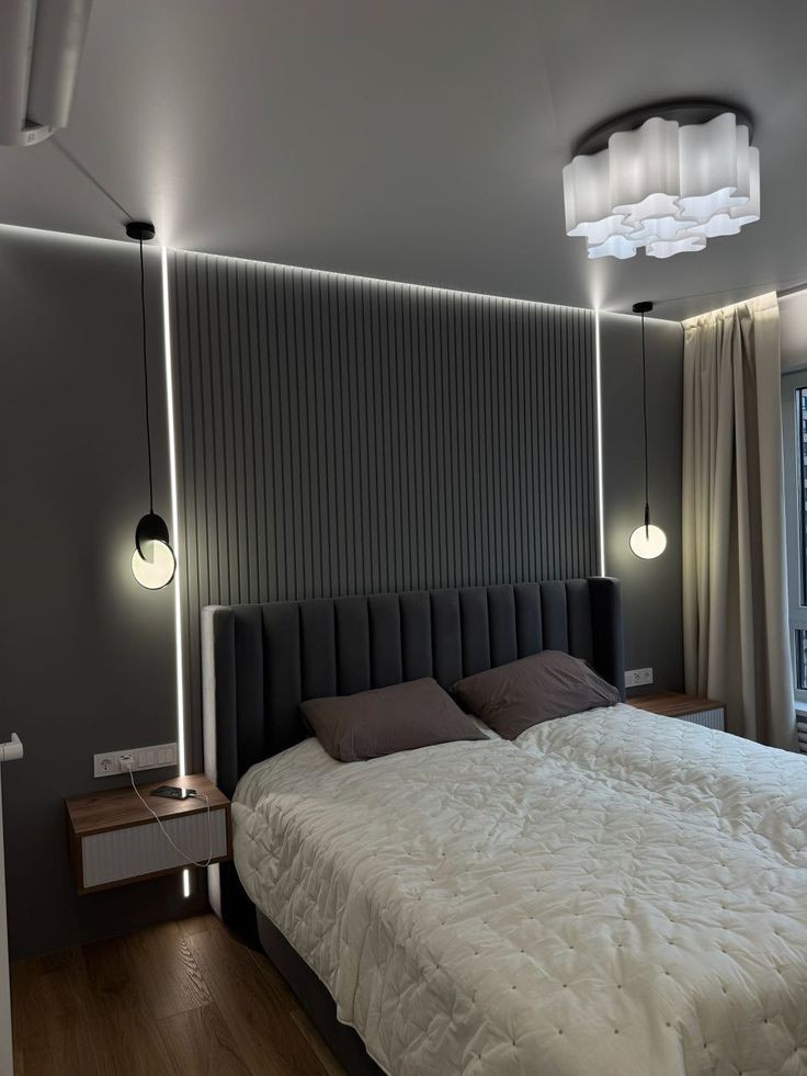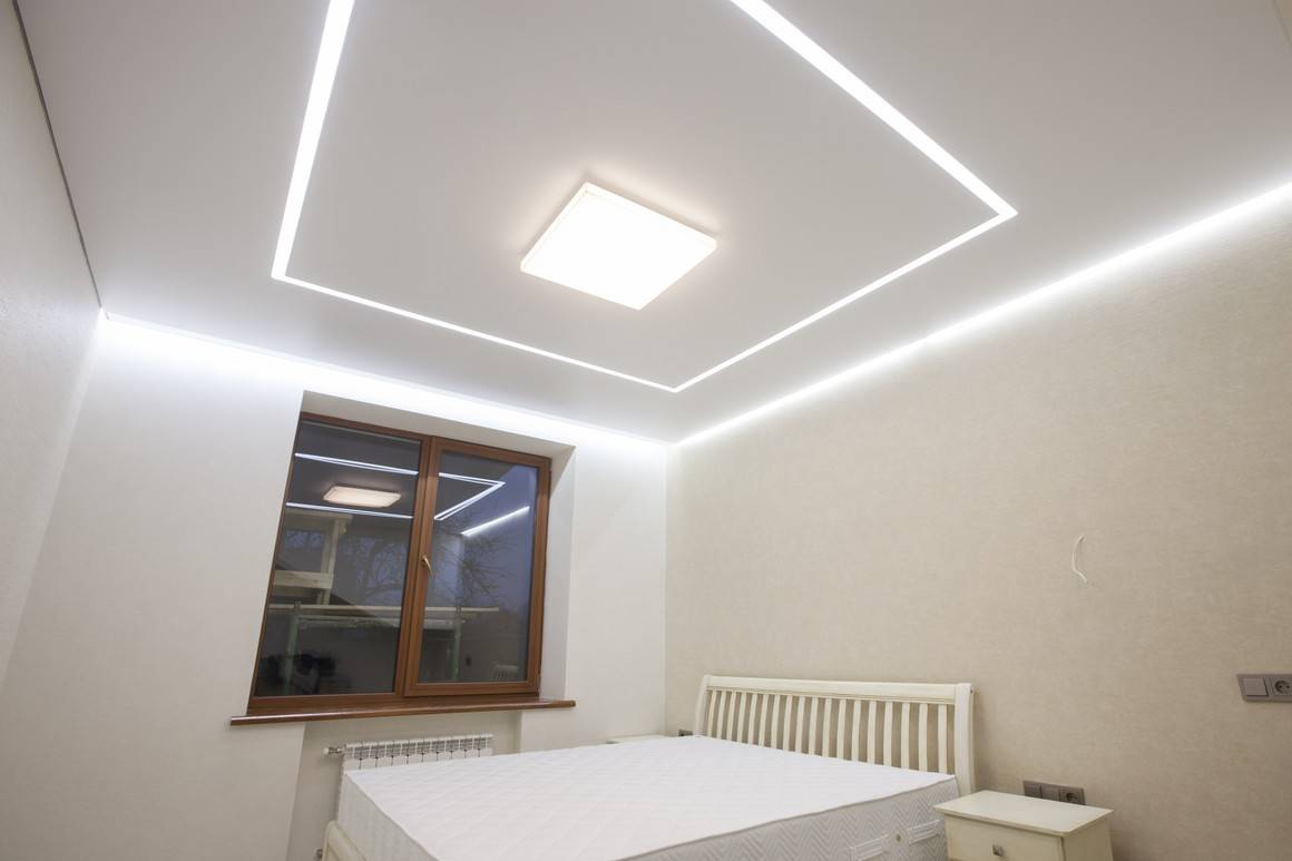 سقف ساده لابل با نورپردازی لوستر، لاین نوری و هالوژن در اتاق خواب